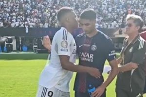 赛后,姆巴佩和巴黎前队友阿什拉夫、贡萨洛-拉莫斯等人拥抱致意。